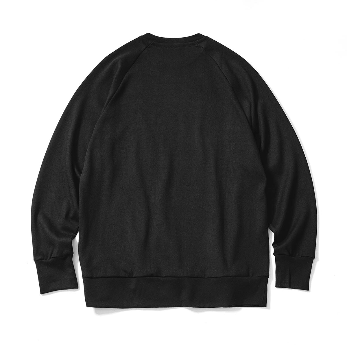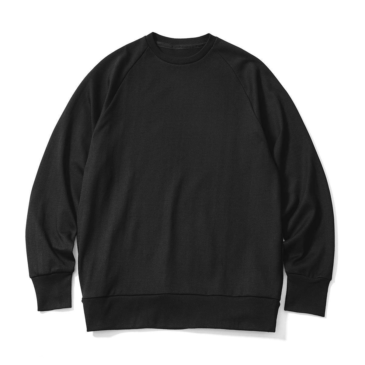 首元は程よく詰まったクルーネックで、上品な印象をキープ。肩まわりにストレスのないラグランスリーブを採用することで、レザーやコートのインナーにも最適です。
